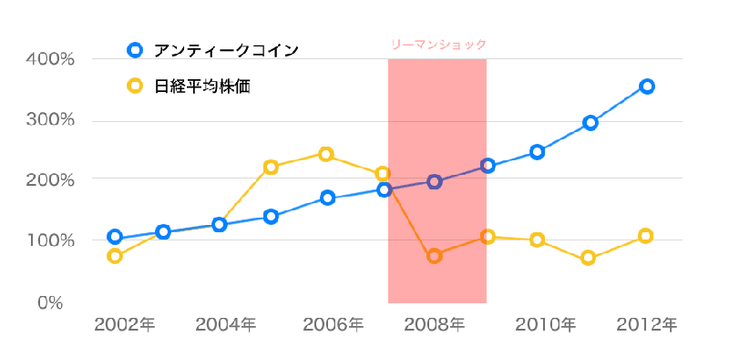 - A:アンティークコインに出会う前に、モダンコイン(近代のコイン)を購入して失敗した。モダンコインは変動が激しく安定性に欠け、価値が下がって無駄になってしまった。